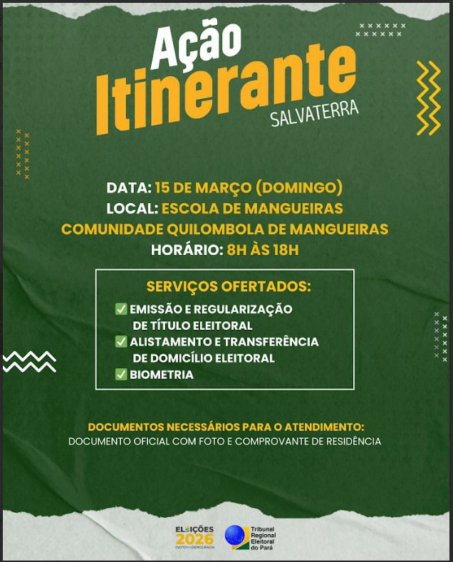 Em parceria com o Tribunal Regional Eleitoral do Pará (TRE-PA), será realizada uma Ação Itinerante levando serviços eleitorais para comunidades quilombolas do município.