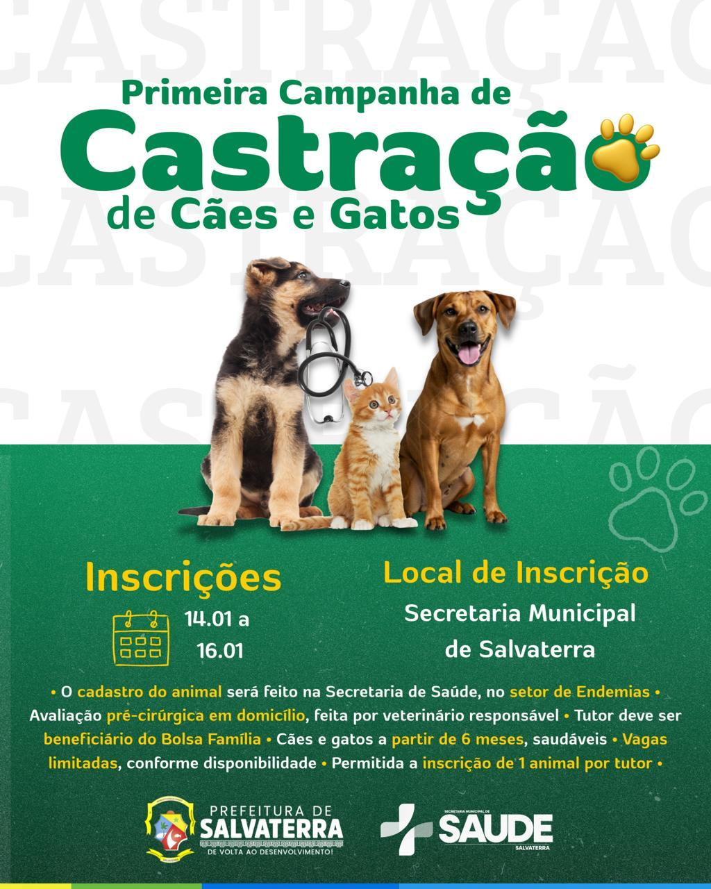 A Prefeitura de Salvaterra, por meio da Secretaria Municipal de Saúde, realiza a Primeira Campanha de Castração de Cães e Gatos, uma importante ação voltada à saúde pública, ao bem-estar animal e ao controle populacional.